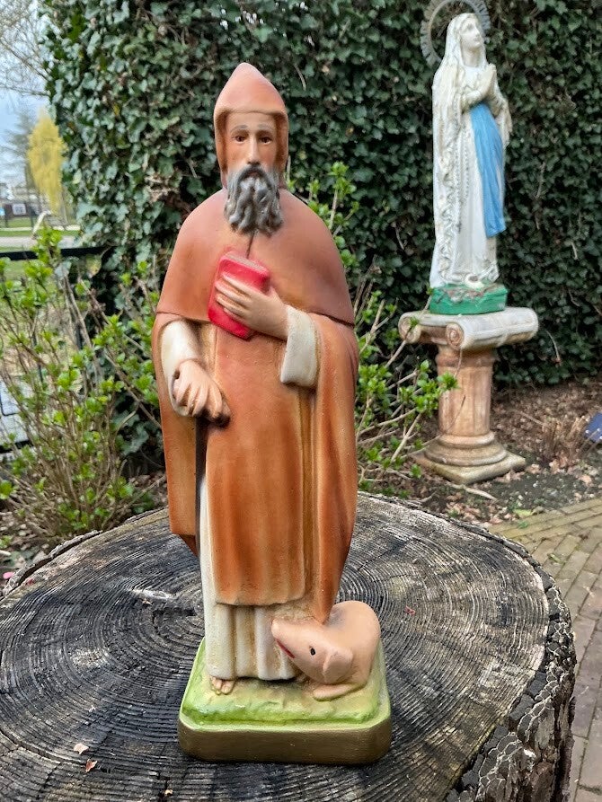 Oud gipsen heiligenbeeld – Sint-Antonius Abt met varken (jaren ’60)